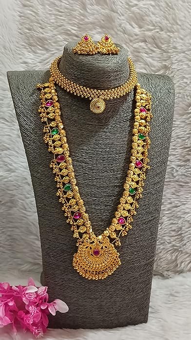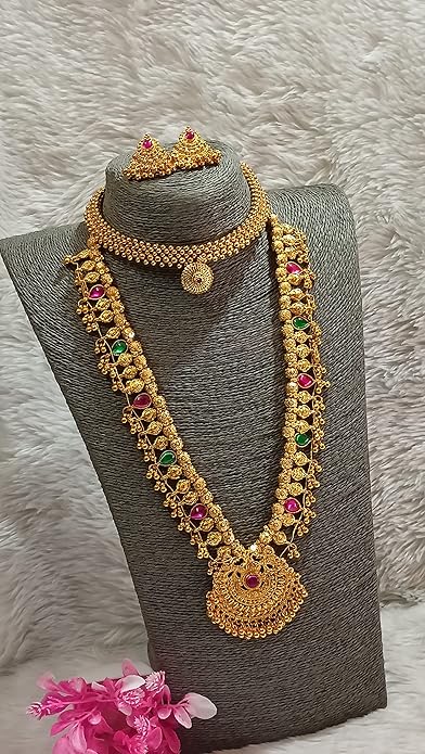 Sajshrungar Jewellery offers this beautiful Golden Jewellery Set that having Long Kolhapuri Saaj, Thushi with 1 pair Earring for women & girls. It is crafted from superior quality metal and ensures high durability. It can style with any type of your jewellery. This Jewellery Set is unique in design and long lasting. This Jewellery Ideal For All Religious Occassions Festivals, Party, Wedding etc. Best option for gift at any occasion.